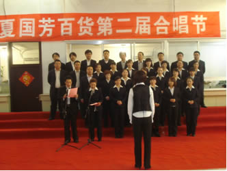 (主持人在現(xiàn)場宣布“寧夏國芳百貨第二屆合唱”節(jié)開幕)