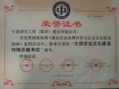 國(guó)芳集團(tuán)在此次發(fā)布會(huì)上榮獲“2012年全國(guó)企業(yè)文化建設(shè)特殊貢獻(xiàn)單位”稱號(hào),這也是依據(jù)中華人民共和國(guó)第一部關(guān)于企業(yè)文化建設(shè)國(guó)家標(biāo)準(zhǔn),綜合考評(píng)的首批全國(guó)企業(yè)文化建設(shè)優(yōu)秀企業(yè)。這是評(píng)選組委會(huì)對(duì)國(guó)芳集團(tuán)多年來(lái)在企業(yè)文化建設(shè)工作成果的巨大肯定,也是國(guó)芳集團(tuán)全體員工在2012年全年度辛勤工作的最好回報(bào)。