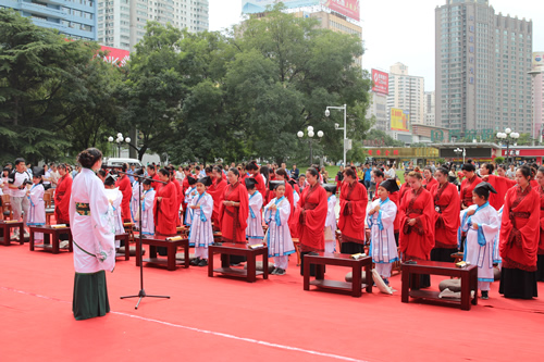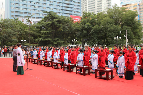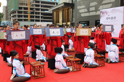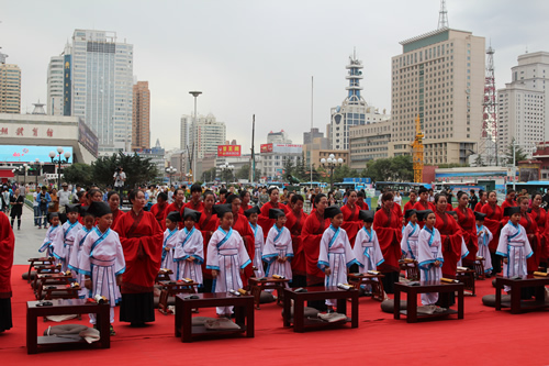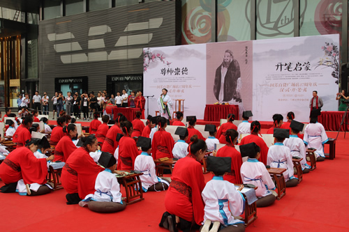 傳承中國文化,啟發(fā)學子奮發(fā)向上,再現(xiàn)古典禮儀之莊重恢弘。9月10日,國芳集團在東方紅廣場舉行大型漢式拜師禮開筆禮儀式。本次活動共招募40名6-9歲的學子參加。拜孔子、點朱砂、擊鼓明志,引眾多市民觀禮。