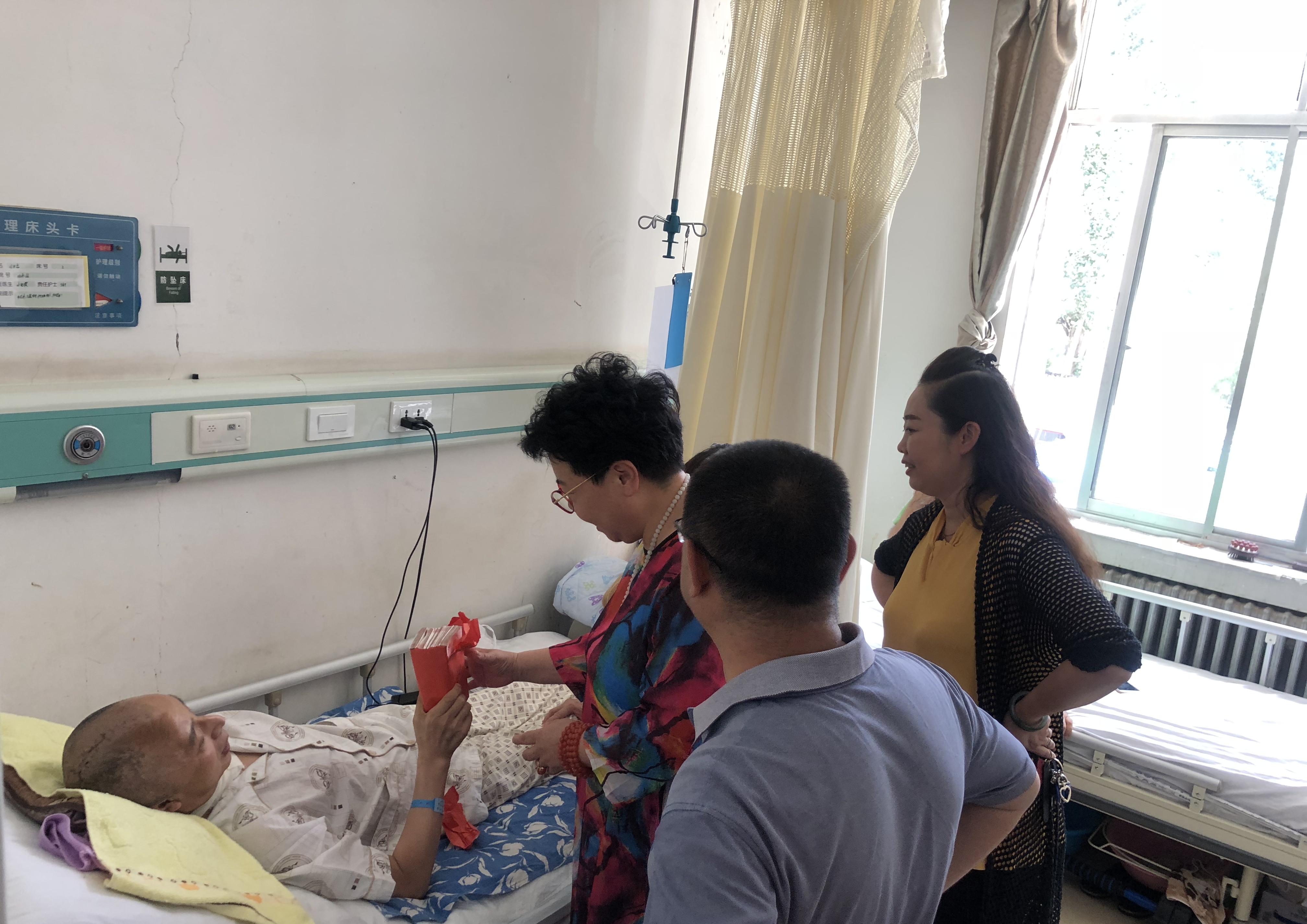 這是公司的一點心意,希望能幫助你們度過難關…”628日下午,甘肅國芳工貿(集團)股份有限公司董事會董事、財務總監(jiān)兼工會主席,人力資源總監(jiān)以及黨委常務副書記一行人驅車趕往蘭州大學第一醫(yī)院東崗院區(qū),慰問公司患病職工閆世忠,并代表公司送上愛心捐款50000元,令閆世忠及其家人備受感動和鼓舞。