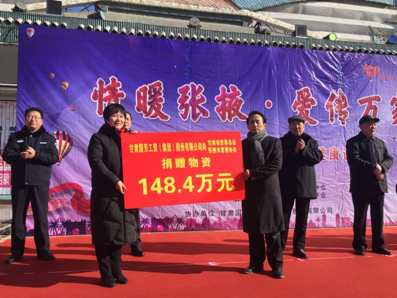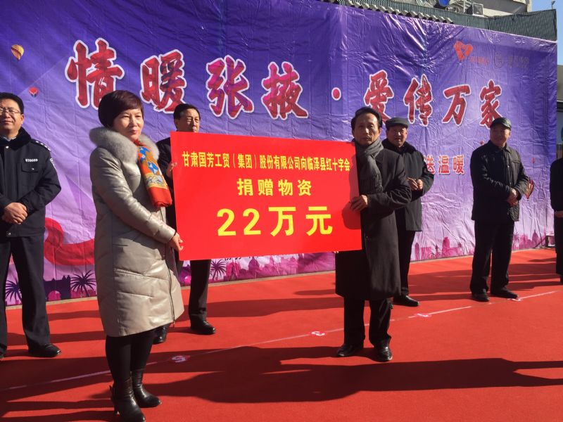 2019年1月11日,甘肅省慈善總會、張掖市慈善協(xié)會、甘州區(qū)慈善協(xié)會以及臨澤縣紅十字會攜甘肅國芳工貿(mào)(集團)股份有限公司在張掖市中心廣場共同舉行“情暖張掖·愛傳萬家”送健康送溫暖活動,將2000套棉衣,2000余套秋衣秋褲,27臺彩電以及300余件小家電合計價值148萬元的過冬物資帶給山丹縣,民樂縣的困難群眾,將2500個醫(yī)藥箱帶給臨澤縣的老人們。此次活動傳導社會幫扶、精準扶貧精神的同時也默默為社會傳導著一份正能量。